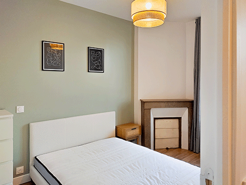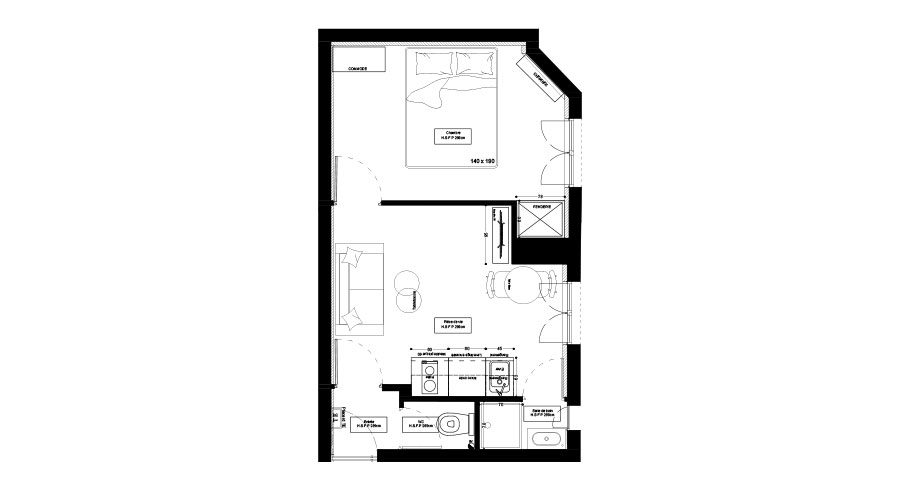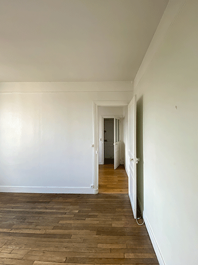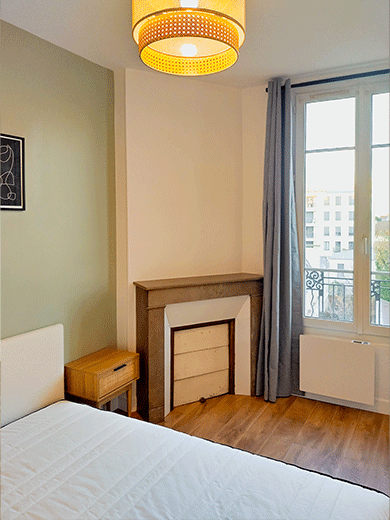 Notre travail s'est principalement concentré sur la redéfinition des espaces et l'harmonisation des volumes. La chambre située à l'extrémité de l'appartement était bien trop grande, tandis que le séjour faisait face aux espaces sanitaires tout en longueur. Ainsi, nous avons déplacé la cloison afin de rééquilibrer les proportions des espaces, créant ainsi un discret renfoncement qui a permis d'installer une télévision et un dressing intégré du côté de la chambre.