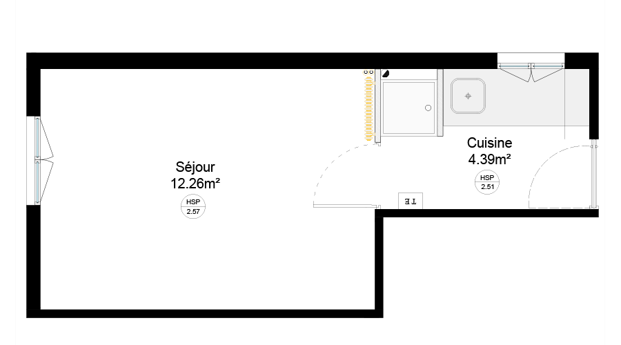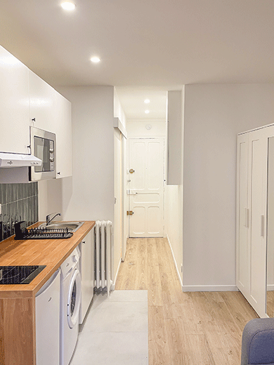 L'objectif de cette rénovation était de doter l'appartement d'une salle d'eau entièrement équipée. Pour ce faire, une démarche préalable a été entreprise auprès de la copropriété pour obtenir l'autorisation de percer le mur et ainsi raccorder les nouveaux toilettes, initialement situés sur le palier. Le réaménagement a principalement concerné l'entrée, permettant ainsi une meilleure délimitation des espaces et offrant davantage d'intimité. Par ailleurs, la cuisine a été déplacée dans le séjour, avec une arrivée d'eau prévue pour la machine à laver. L'installation de toilettes et d'une machine à laver dans l'appartement a considérablement rehaussé la valeur locative du logement.