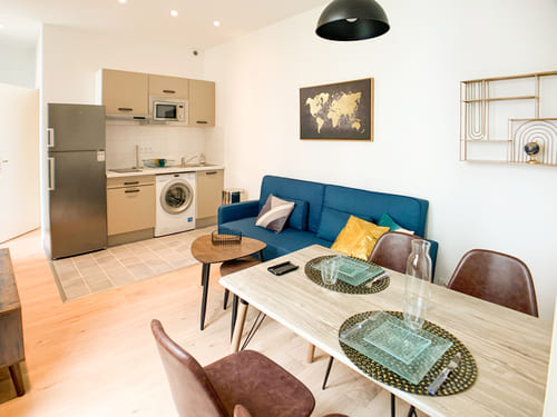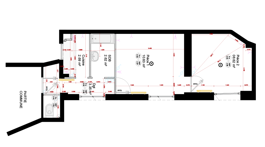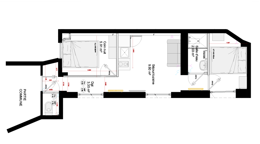 Nous avons transformé cet ancien deux pièces en T3 contenant deux espaces nuits. La cloison séparant l'ancienne salle de bain et l'ancienne cuisine a été abattue pour pouvoir transformer cet espace en chambre. Une nouvelle salle d'eau a été créée dans dans la pièce à l'extrémité de l'appartement. L'espace restant a été aménagé en coin nuit. Enfin, la nouvelle cuisine à été installée le long du mur dans le séjour pour optimiser les espaces communs.