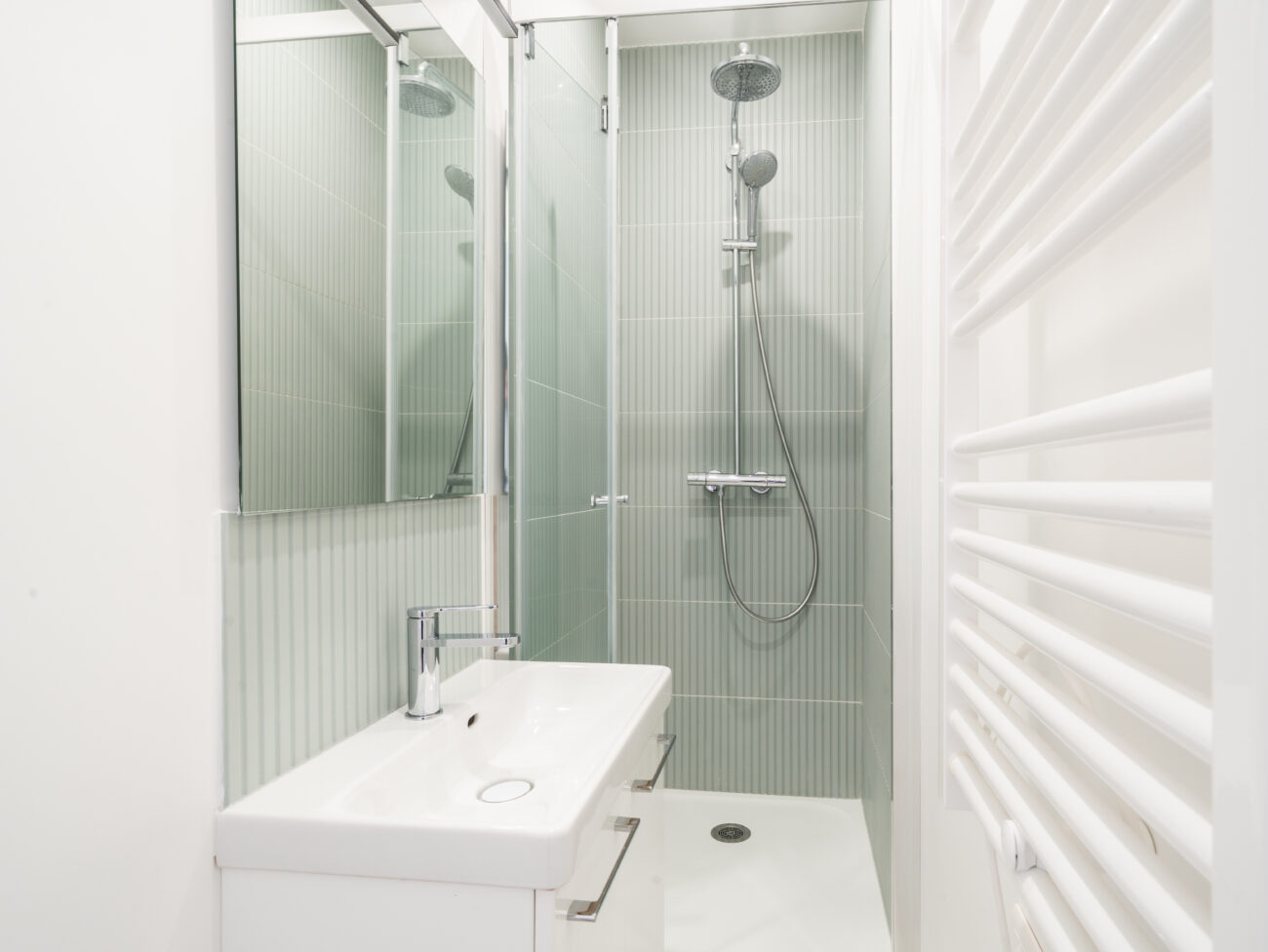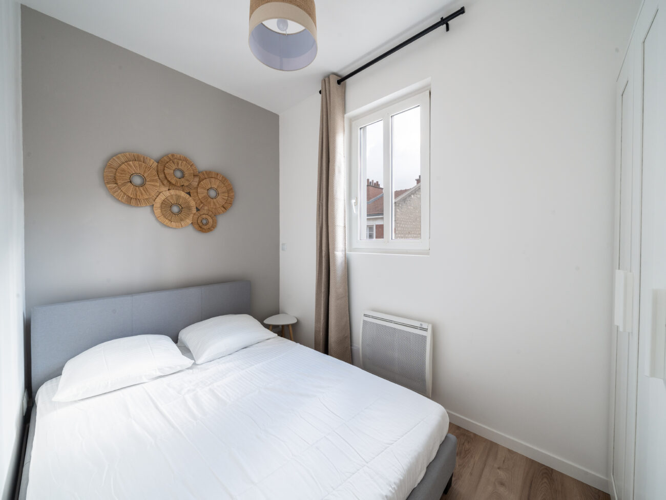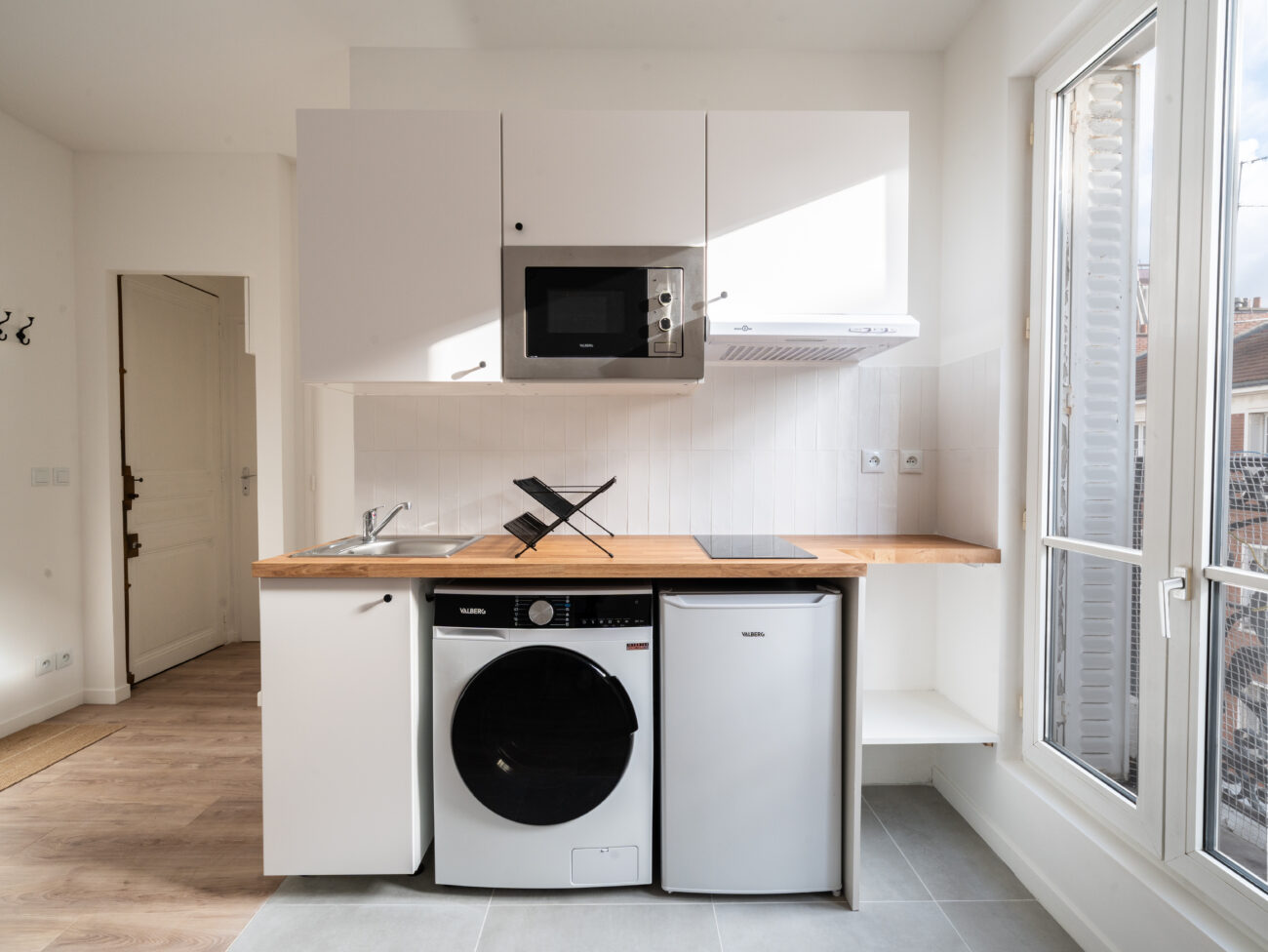 L’appartement a été repensé afin d’optimiser chaque mètre carré disponible. Une nouvelle chambre a été créée dans l’ancienne cuisine, grâce à la présence d’une seconde fenêtre, ce qui permet d’augmenter le loyer par rapport à un studio de surface équivalente et d’attirer une clientèle diversifiée, soucieuse de pouvoir recevoir des invités. Les équipes ont également procédé à une rénovation complète : murs, sols et plafonds, remplacement des menuiseries pour une isolation améliorée, et reconfiguration de la salle d’eau afin d’offrir un espace fonctionnel et harmonieux. Le résultat : un appartement confortable, lumineux et parfaitement adapté à la demande locative locale, avec une belle pièce de vie et une chambre supplémentaire.