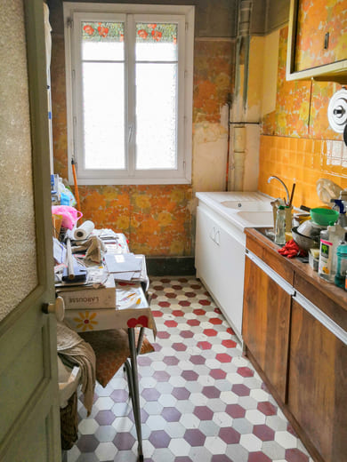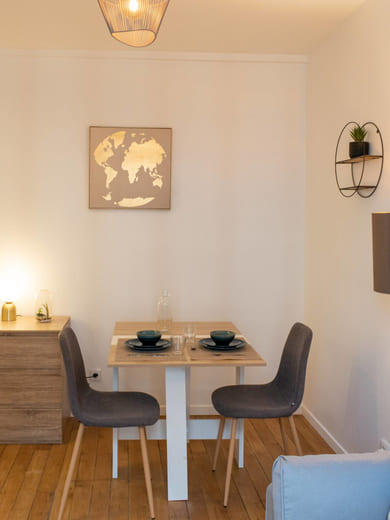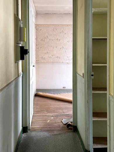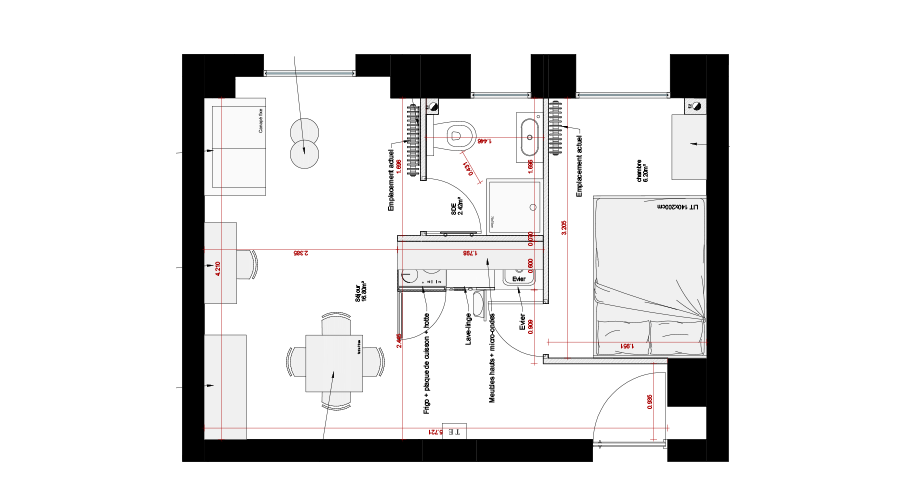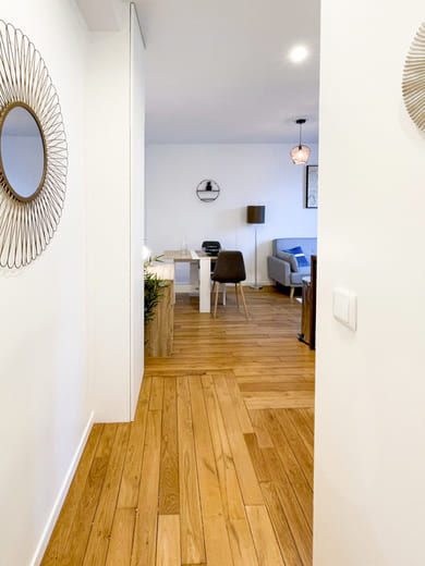 L'objectif de rénovation de cet appartement était de le reconfigurer en T2. Nous avons alors transformé l'ancienne cuisine en chambre en gardant la même surface. Nous avons également rétréci la salle d'eau puis installé la cuisine contre la nouvelle cloison. Ainsi, il a été possible de conserver des espaces séparés pour la pièce de vie tout en créant une sensation de volume.