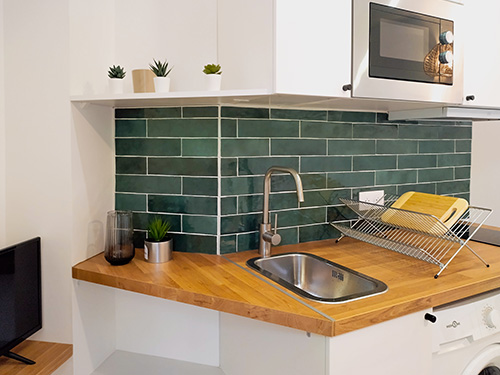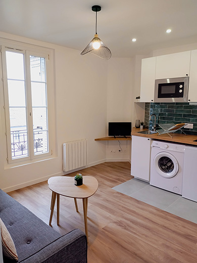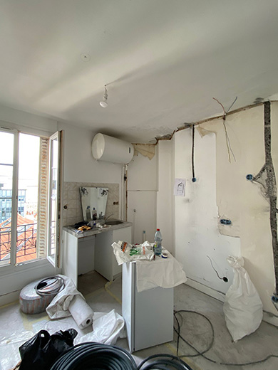 Pour cette rénovation, nous avons procédé au rafraîchissement des revêtements, à une amélioration de l'isolation, et à une optimisation des volumes. Une légère modification de la cloison a été entreprise afin de réduire l'espace dédié à la chambre, augmentant ainsi la superficie du séjour. Cette initiative nous a permis d'optimiser l'aménagement de la cuisine pour offrir un confort accru, tout en délimitant judicieusement les espaces de vie pour répondre aux besoins d'un jeune professionnel, d'un étudiant, ou d'un jeune couple.