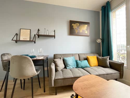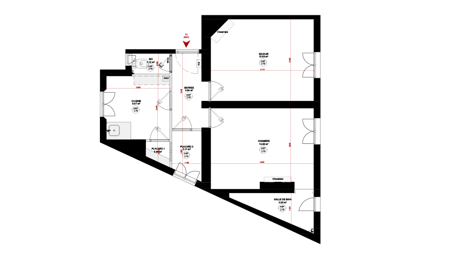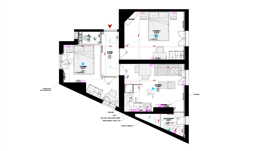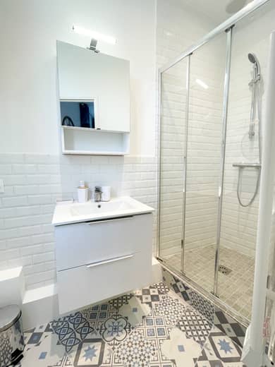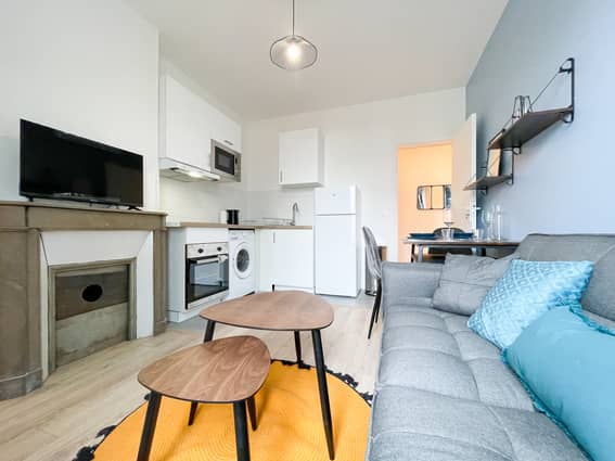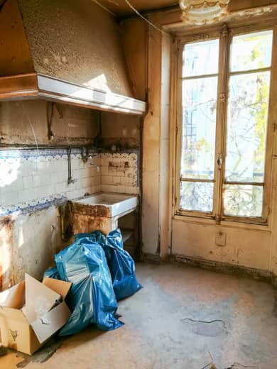Avant les travaux de rénovation, ce bien était configuré comme un T2 avec une seule chambre. Pour augmenter la rentabilité, une chambre supplémentaire a été créée, imposant de déplacer la cuisine et la salle d'eau. L'ancien séjour a été transformé en chambre et le salon a été déplacé dans l'ancienne cuisine. En démolissant les placards et leurs cloisons, nous avons pu agrandir considérablement l'espace de la nouvelle chambre et lui offrir une deuxième fenêtre.