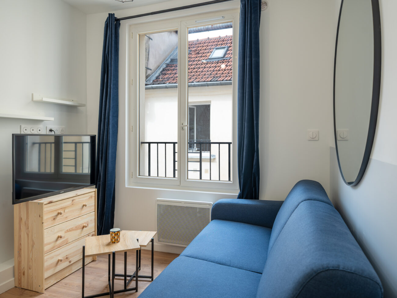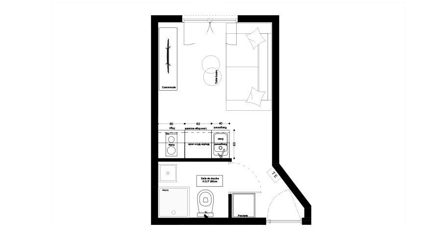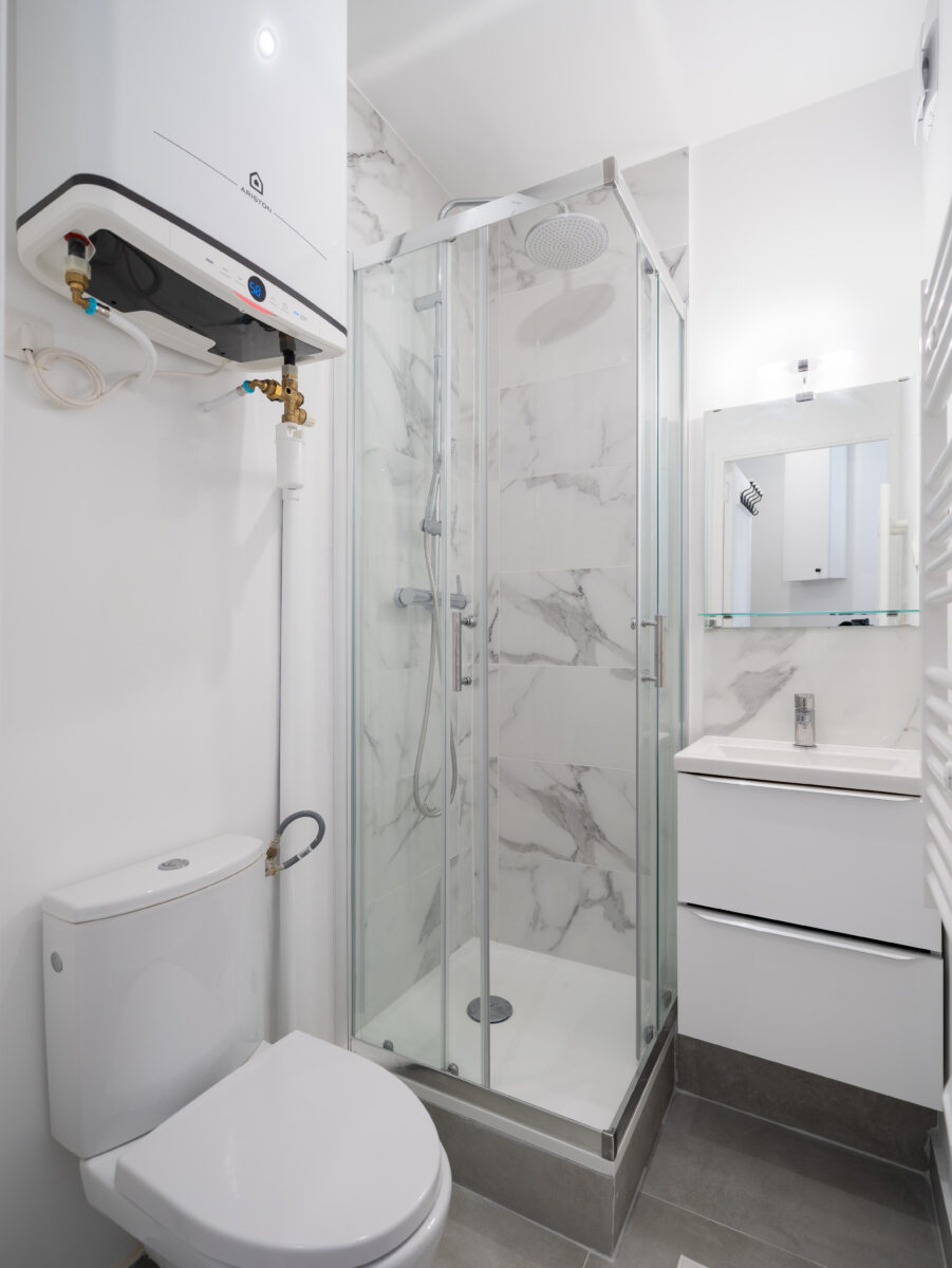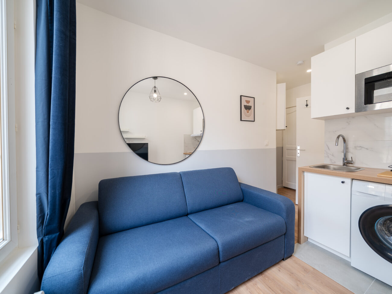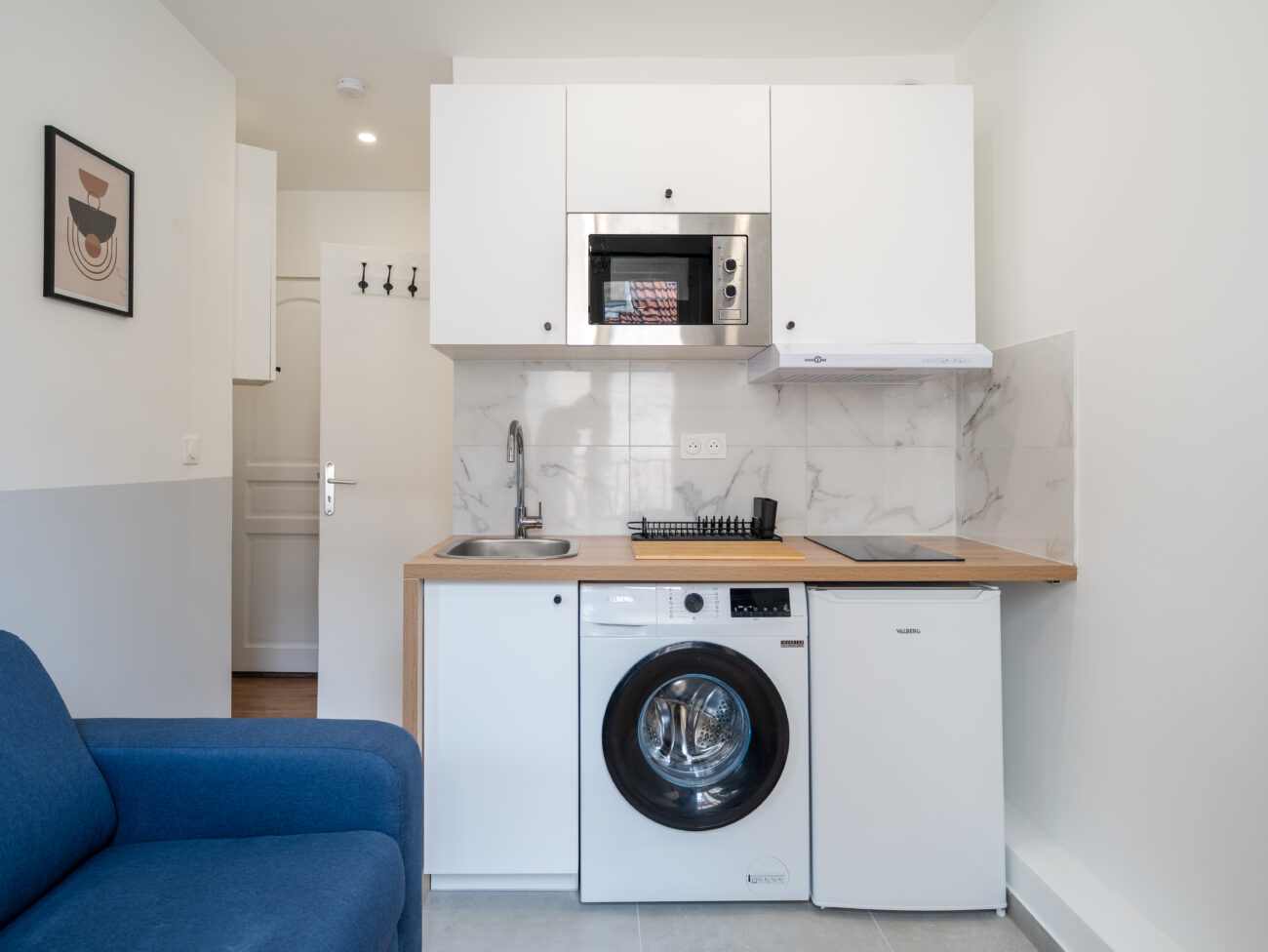 Dans cet espace restreint, nous avons mis l’accent sur le confort et la fonctionnalité en intégrant une cuisine équipée avec lave-linge, un aménagement rare pour ce type de surface. Les travaux ont également porté sur la rénovation des revêtements afin d’améliorer la performance énergétique du logement, contribuant ainsi à un meilleur classement au DPE.