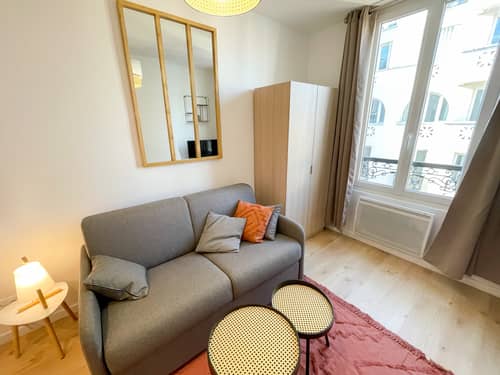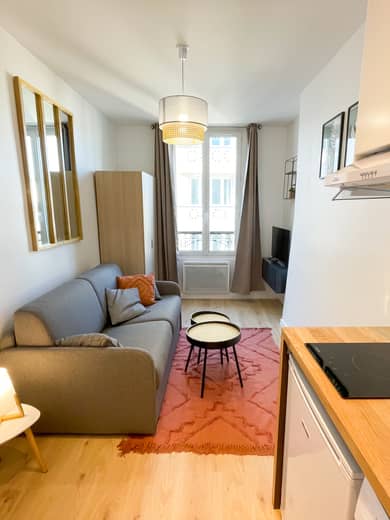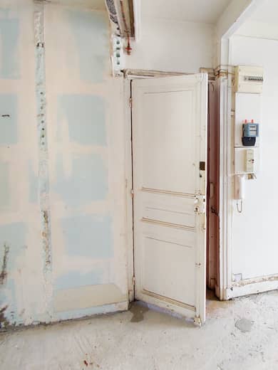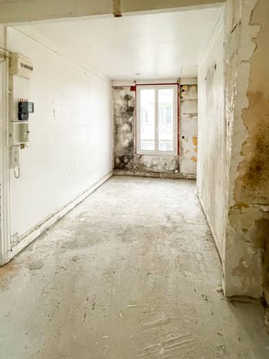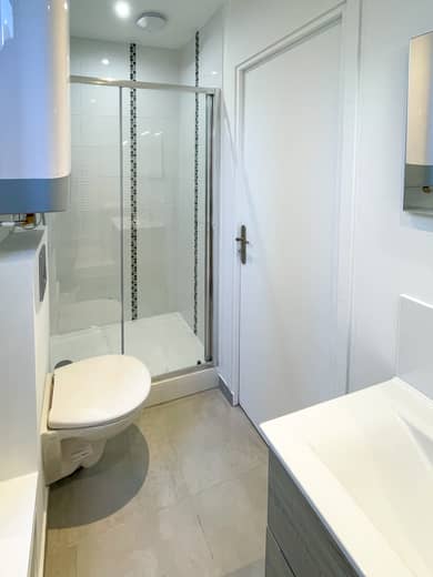 Dans cet appartement traversant où tout était à imaginer, nous avons optimisé l'espace au maximum en créant un espace de vie et une grande salle d'eau bénéficiant d'une fenêtre. Une cuisine en longueur a été installée face à la porte d'entrée pour pouvoir installer le coin nuit proche de la seconde fenêtre.