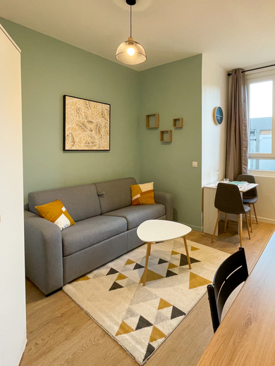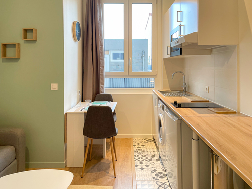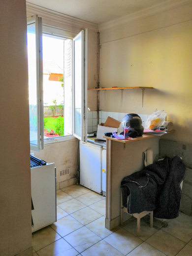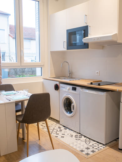Dans cet appartement, nous avons opté pour un bon rafraîchissement des murs et des sols. Le parquet donne plus de charme et de chaleur au logement. Côté optimisation de l'espace, nous avons démoli le demi-mur séparant le séjour pour agrandir la cuisine. Elle a ainsi été agrandie pour ajouter des plans de travail et un lave-linge.