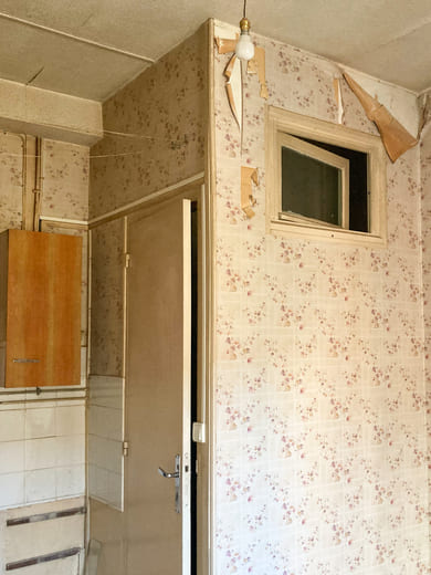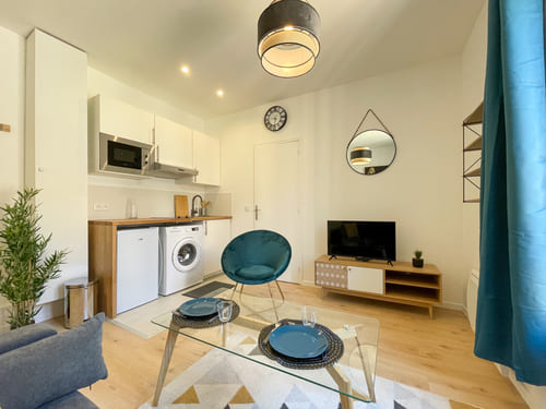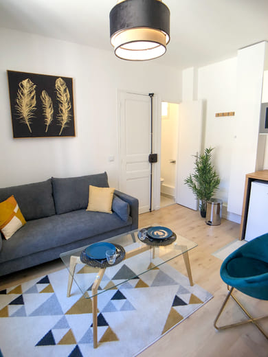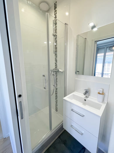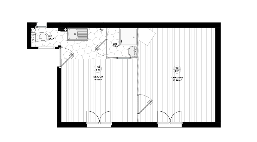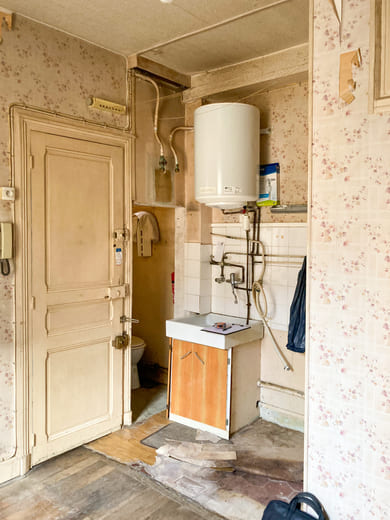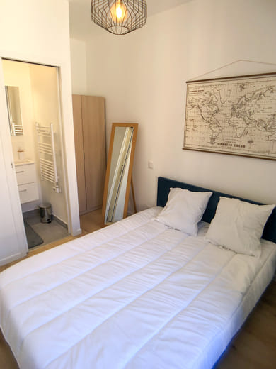 Nous avons optimisé cet appartement dans l'optique de réduire la surface de la chambre pour augmenter celle du séjour, l'idée étant d'installer un coin salon et une cuisine totalement équipée. La salle d'eau a été déplacée dans la chambre pour laisser de la place à des plans de travail et permettre la création d'un sas d'entrée. Nous avons légèrement décalé la cloison séparant le séjour et de la chambre et inversé l'ouverture de la porte pour ne pas buter sur le lit. Les toilettes ont enfin été séparées du séjour pour apporter plus d'intimité.