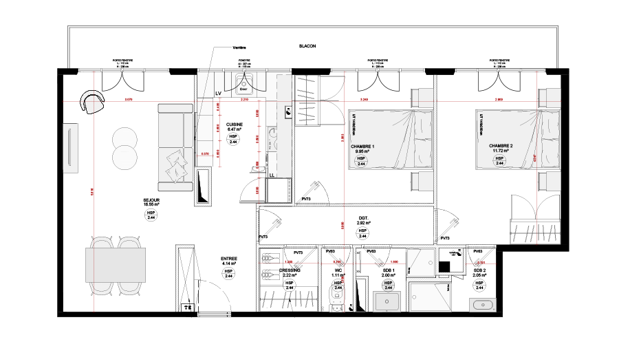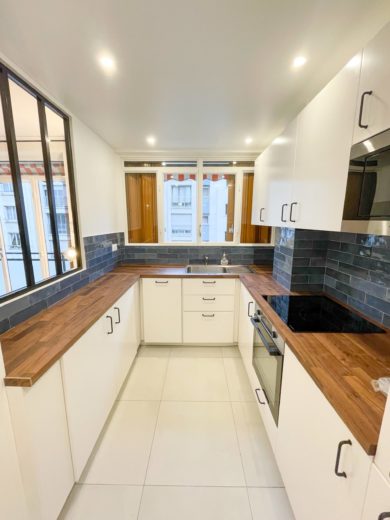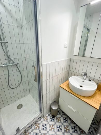 Pour optimiser au maximum l'espace de ce grand appartement, nous avons réduit la surface de l'entrée et démoli la porte la séparant du séjour. Nous avons pu ajouter une pièce servant de rangement à proximité des WC puis transformer la grande salle d'eau en deux plus petites. Cela a permis de créer une suite parentale avec sa propre salle d'eau.