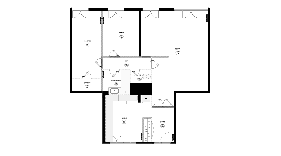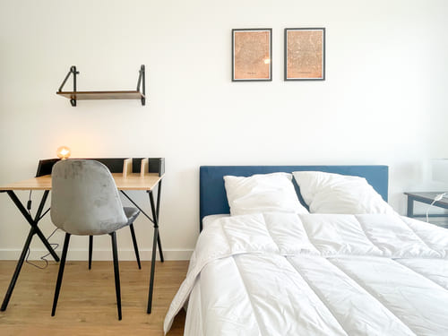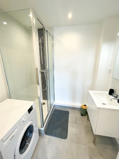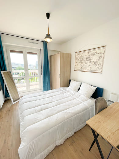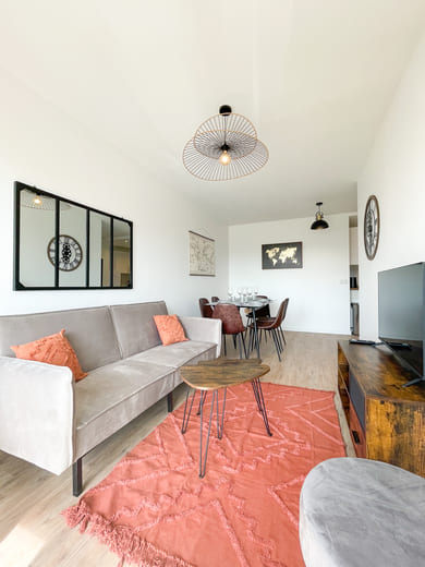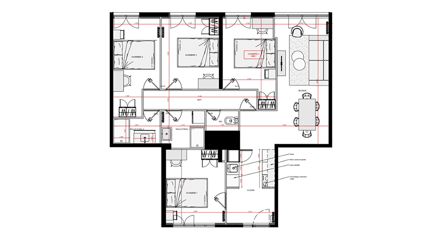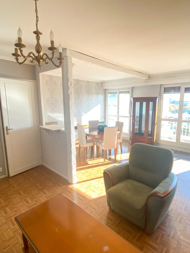 Dans ce grand appartement de presque 80m², l'objectif était de transformer l'espace en véritable colocation pour quatre personnes. Le challenge a été de tout repenser pour optimiser la surface au maximum en réinventant l'espace cuisine, en créant une nouvelle salle d'eau et en ajoutant deux chambres supplémentaires. Nous avons alors réduit l'espace de vie et installé la cuisine dans le nouveau passage reliant l'entrée au séjour. Les nouvelles chambres ont été créées d'un côté dans l'ancienne cuisine et de l'autre côté sur la surface de l'ancien salon.
