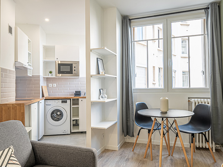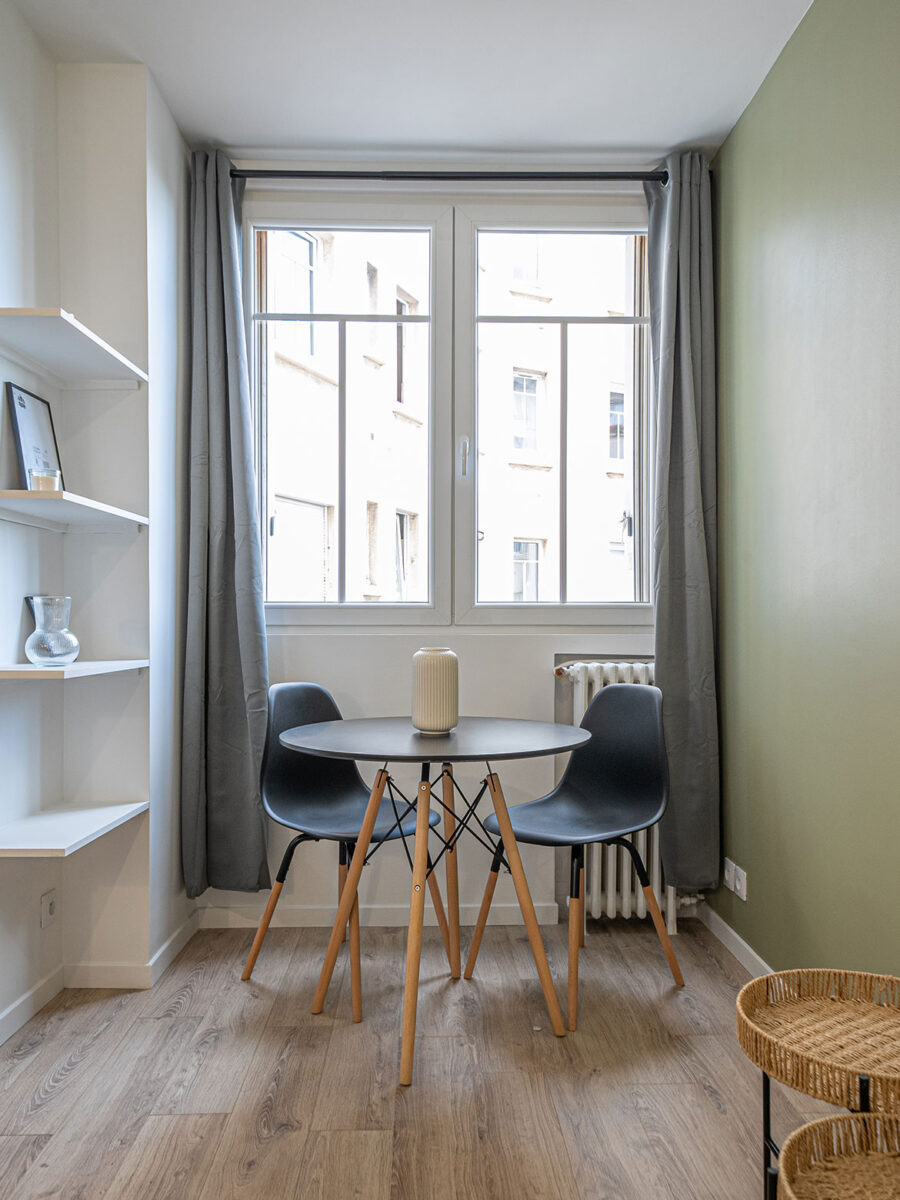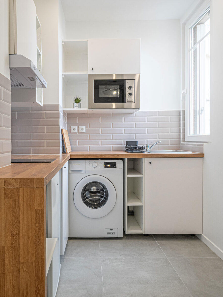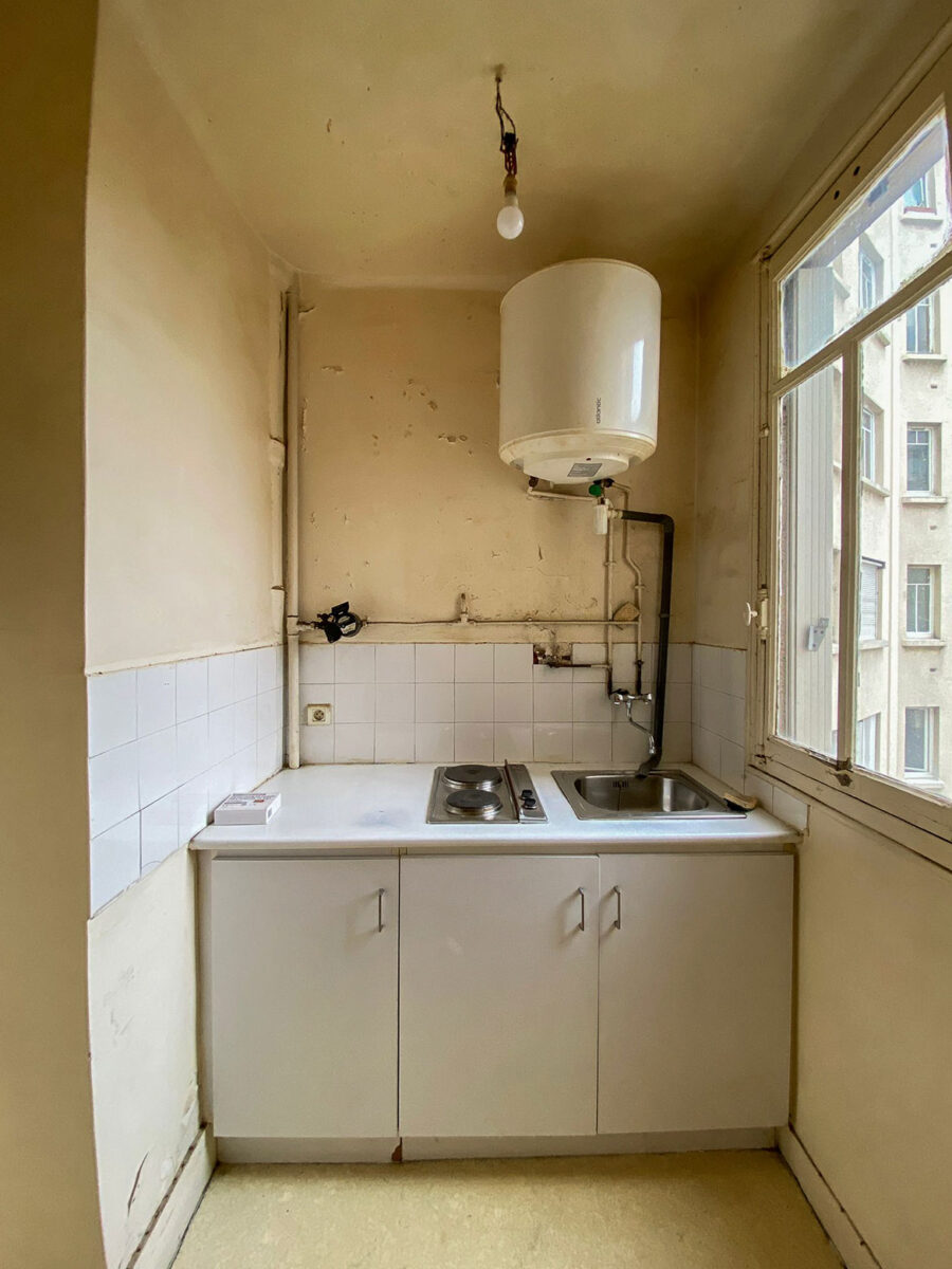 Nous avons concentré les travaux sur l’assainissement du bien et l’amélioration de sa performance énergétique. La salle d’eau nécessitait une reconfiguration en raison d’un couloir étroit entraînant une perte d’espace. Nous l’avons agrandie pour offrir plus de fonctionnalité et de confort. La cuisine a été ouverte sur le séjour, créant ainsi une impression de volume et d’espace. Enfin, les revêtements ont été modernisés afin de donner à l’ensemble une allure contemporaine et accueillante.