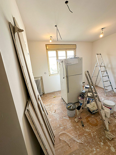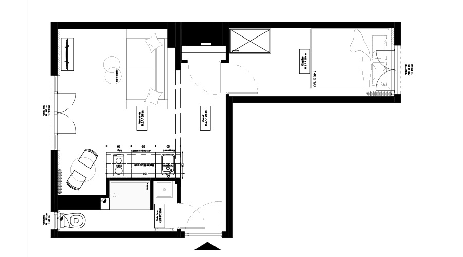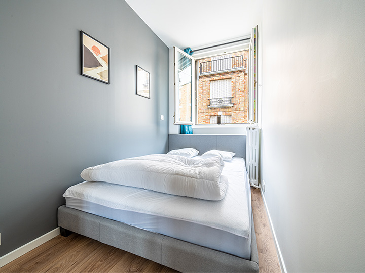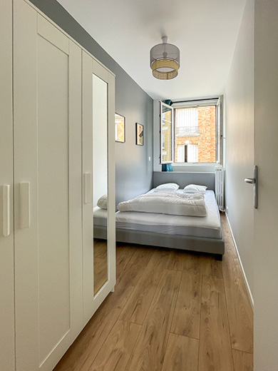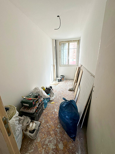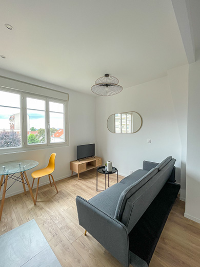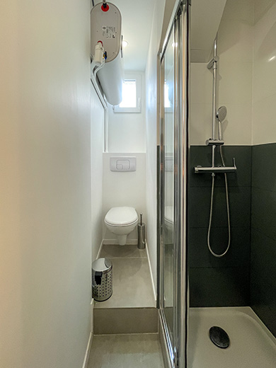 Le bien était déjà bien agencé. Pour cette rénovation, nous avons principalement agrandi la salle d'eau pour installer une cabine de douche complète, ce qui devrait augmenter considérablement sa valeur locative. En déplaçant la cuisine vers le séjour, nous avons créé une chambre supplémentaire. Cet agencement, avec une chambre et un espace lave-linge, est conçu pour attirer des jeunes actifs. De plus, nous avons optimisé l'espace en créant une zone dédiée aux repas pour utiliser tout le volume disponible.