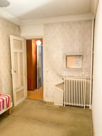 Cet appartement était beaucoup trop cloisonné avec des pièces qui n'ont plus d'usage aujourd'hui. Nous avons abattu la totalité des cloisons de l'entrée pour y installer la nouvelle cuisine en longueur. Ainsi, il a été possible d'agrandir la salle d'eau et d'optimiser l'espace restant pour déjeuner. Le salon a également été agrandi grâce à la démolition des cloisons du placard et du débarras.
