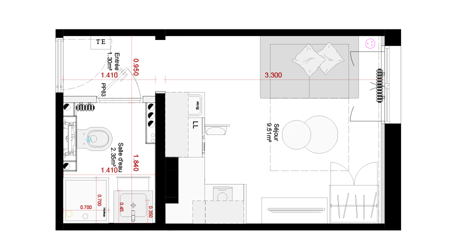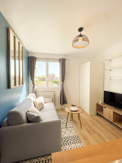 Cet appartement nécessitait surtout des travaux de rafraichissement ainsi qu'une optimisation des espaces de vie. Nous avons retiré la porte séparant l'ancien couloir du séjour pour ajouter de la profondeur à la pièce dès l'entrée. L'emplacement de la cuisine a été légèrement modifié pour pouvoir en installer une plus grande tout en maximisant l'optimisation des espaces.
