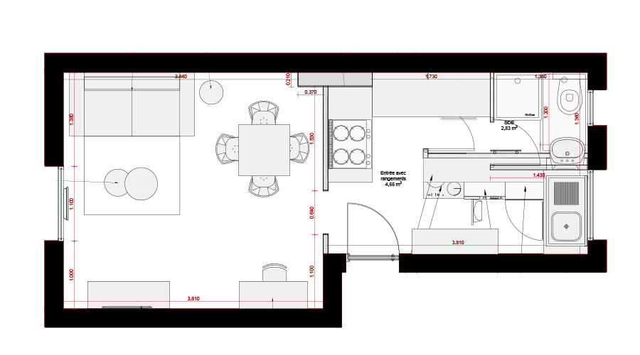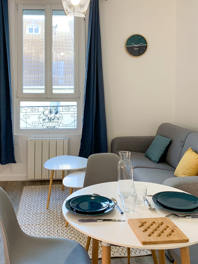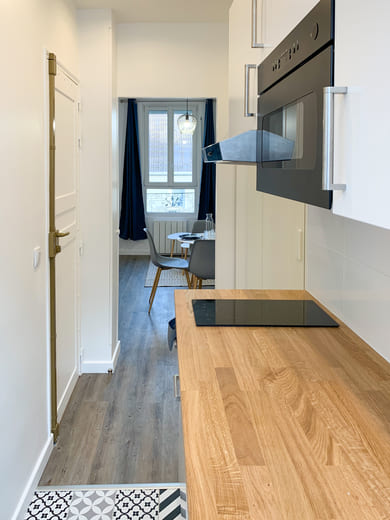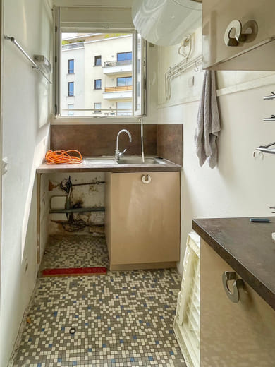 A l'origine, l'espace de ce studio regroupant la cuisine et la salle d'eau était mal distribué. Nous avons alors réduit la taille de la salle d'eau pour pouvoir agrandir la cuisine en installant un grand plan de travail. Enfin, nous avons optimisé la surface de cet appartement au maximum en choisissant un mobilier adapté.